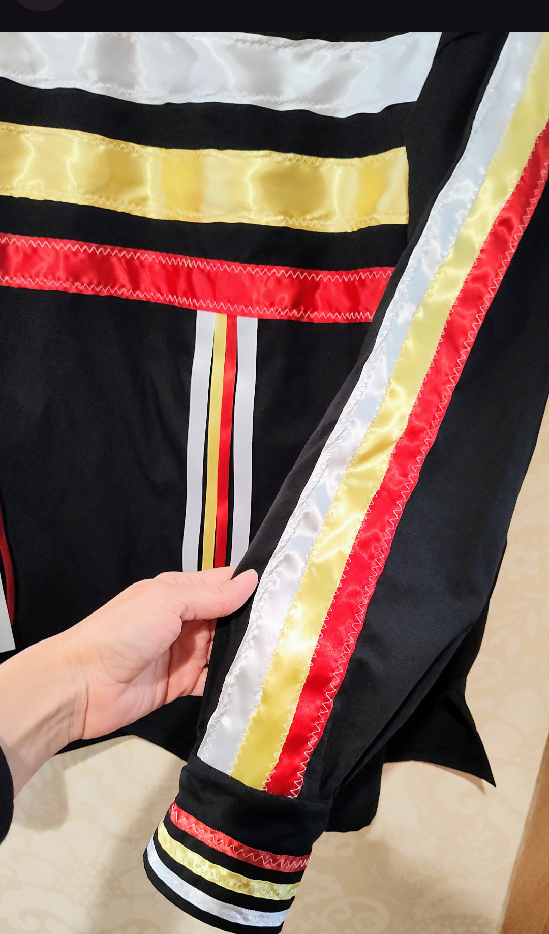 A Native American Ribbon Shirt, a early drop sleeve pattern was used to design this beautiful piece! Black Cotton material used for shirt design with white, yellow and red ribbons. Ribbon orientation goes across the front of chest and back of shirt with same ribbon colors trailing down. Ribbon colors also go vertical down sleeves, on cuffs and collar. Native buttons to fasten cuffs. Shirt can be made in other colors if desired just message me if you prefer a different color shirt and ribbons.