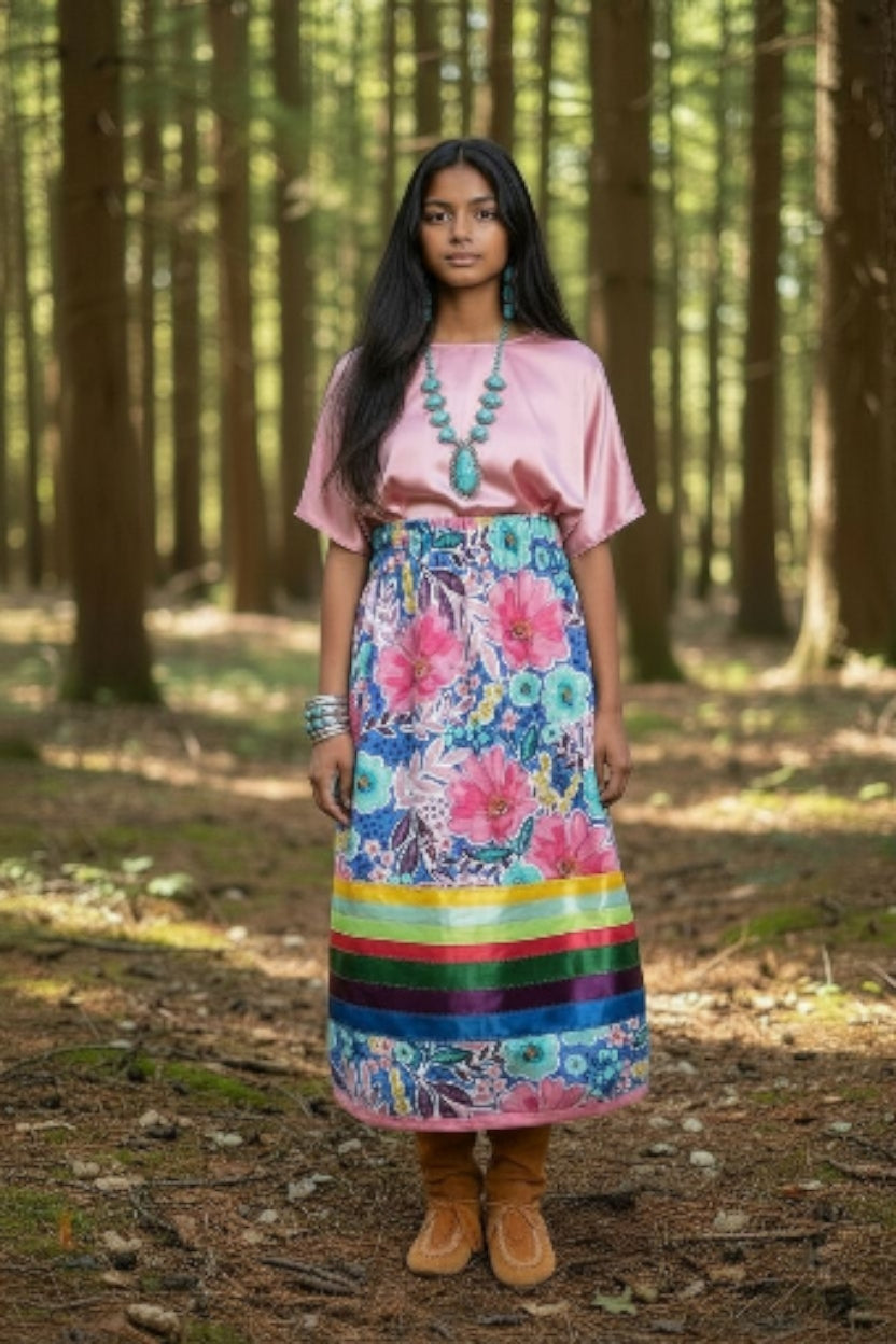 A Floral Cotton Ribbon Skirt Handmade Native Made, 7 ( Seven ribbon colors include) Royal blue, purple, grass green, hot pink, lime, teal and yellow. Hidden pockets, two channel Paperbag waistband, pink bias tape to bottom hem of skirt.
